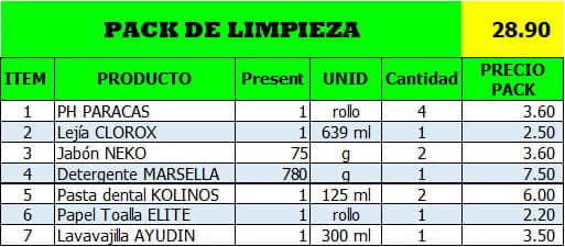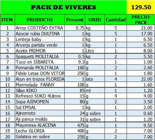 Packs de víveres y Packs de Limpieza, víveres de primera necesidad x unidades…
